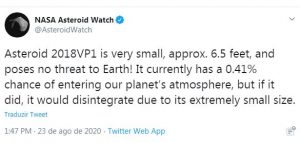 O asteróide 2018VP1 é muito pequeno, aproximadamente dois metros, e não representa nenhuma ameaça para a Terra! Atualmente, tem 0,41% de chance de entrar na atmosfera do nosso planeta, mas se isso acontecesse, se desintegraria devido ao seu tamanho extremamente pequeno.