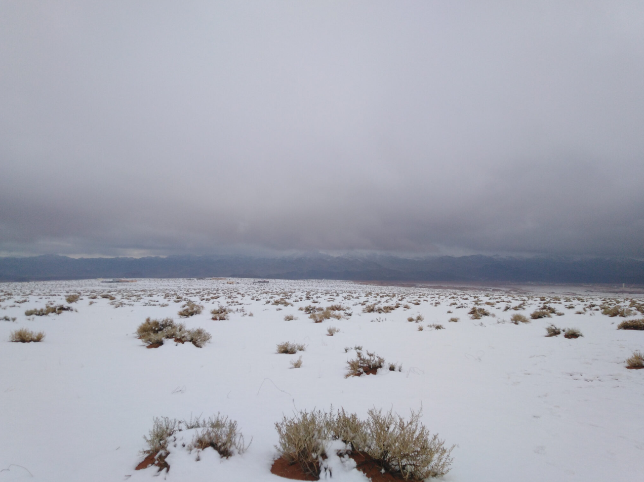 Uma rara queda de neve cobriu partes do deserto arábico esta semana, transformando trechos de terra ao longo da fronteira entre Arábia Saudita e Emirados Árabes Unidos em uma extensão branca contínua e atraindo grande atenção após imagens de vídeo serem espalhadas em X. Um vídeo mostra um carro dirigindo por um terreno coberto de neve sob nuvens cinzas densas, com camelos visíveis em um terreno normalmente resseco e marrom. A escala da neve é impressionante, cobrindo vastas áreas abertas em vez de colinas ou picos isolados.